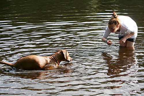 Alaya beäugt Desys Schwimmversuche - versteht wohl auch nicht warum sie so